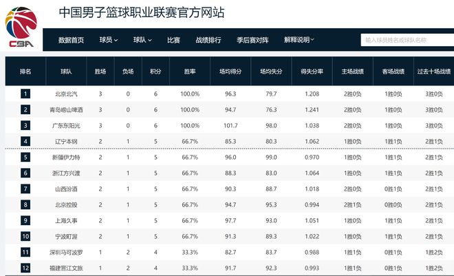 CBA第3轮积分榜:3队全胜,4队全败,广东队冲进前三名