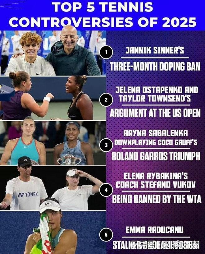 我们再来关注外媒的消息。近期,有外媒评选出了今年世界网坛的五大事件。排在第一位的是前世界第一、意大利名将辛纳因药检阳性被禁赛三个月;第二个事件是拉脱维亚名将奥斯塔彭科和美国人汤森德在美网发生争吵;第三个事件是女单世界第一萨巴伦卡在法网决赛不敌美国一姐高芙之后发表不当言论;第四个事件是哈萨克斯坦名将莱巴金娜的教练武科夫因“言语虐待”等行为遭WTA禁赛;最后一个事件是英国一姐拉杜卡努在迪拜遭遇狂热粉丝的跟踪,一度受惊吓落泪。外媒评选出的这五大事件,与您的看法一致吗?