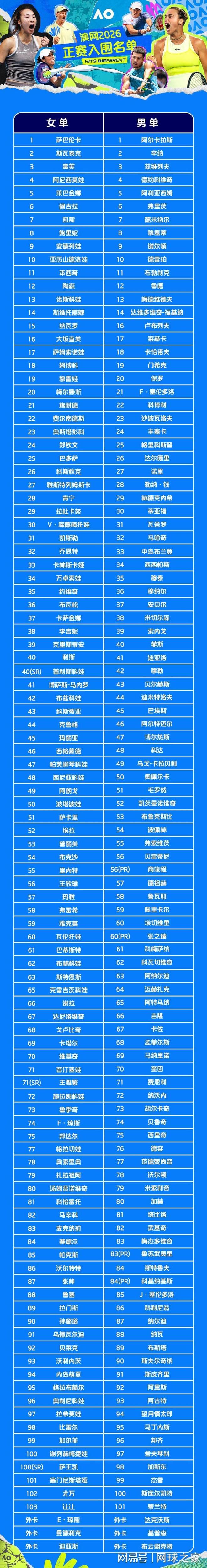 北京时间昨天,2026澳网官宣了男女单打正赛入围球员名单,中国男三女四共七位球员榜上有名,其他世界排名TOP103的球员也悉数入围。为了方便球友了解参赛阵容的详细情况,我们搬运了澳网官方的中文版大名单,您可以在附图中找一找,看看您的偶像在不在?