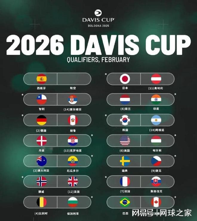 我们再来关注戴维斯杯。北京时间昨晚,2026赛季戴维斯杯资格赛的抽签结果出炉,27支球队将争夺7个八强席位。卫冕冠军兼主办国意大利队直接入围八强战,今年的亚军西班牙队则享受首轮轮空待遇。