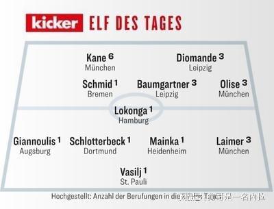 完成帽子戏法的拜仁慕尼黑前锋凯恩本赛季第6次入选周最佳阵容,和利物浦、热刺传出绯闻的RB莱比锡天才攻击手杨·迪奥曼德则第3次入选,前阿森纳球员、目前效力于汉堡的比利时中场洛孔加也首次入围。 《踢球者》评选德甲第13轮最佳阵容 守门员:瓦西里(圣保利) 后防线:莱默尔(拜仁慕尼黑)、梅恩卡(海登海姆)、施洛特贝克(多特蒙德)、基尼洛斯(奥格斯堡) 中场:洛孔加(汉堡)、斯赫米德(云达不莱梅)、鲍姆加特纳(RB莱比锡) 攻击线:凯恩(拜仁慕尼黑)、奥利塞(拜仁慕尼黑)、杨·迪奥曼德(RB莱比锡) |