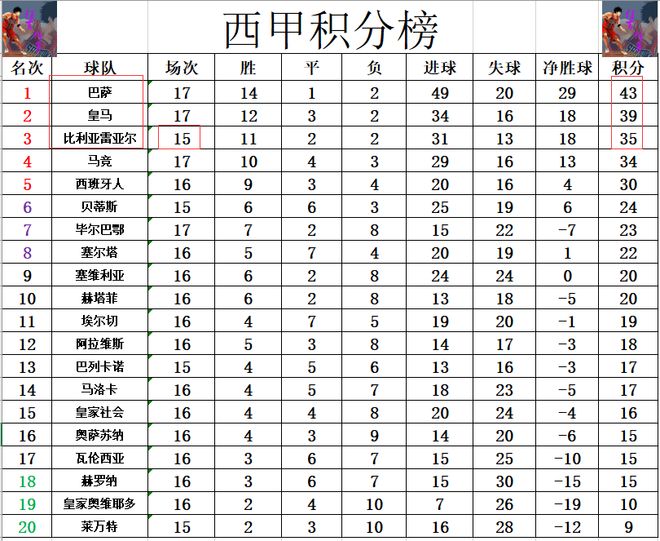 积分榜方面,皇马险胜赢球后还不算彻底崩盘,还是差巴萨4分暂时位列第2。比利亚雷亚尔少赛2场,落后皇马4分位列第3,他们差的2场若都能赢球,就会将皇马挤出前2。毕尔巴鄂竞技客场完败无力追赶黑马西班牙人,多赛一场还落后西班牙人7分,要想争5的话难度很大。