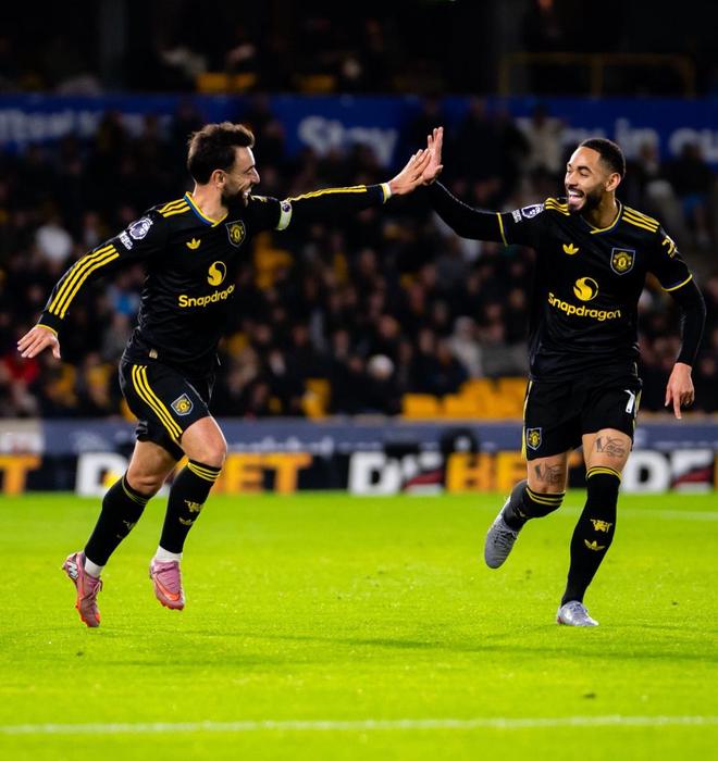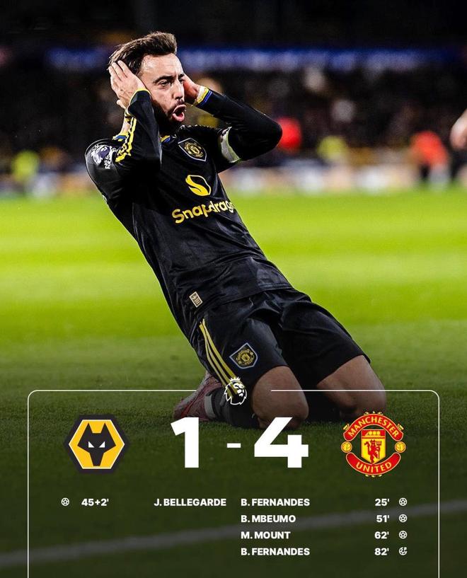 比赛一开始,曼联就反客为主,率先主动发起进攻,第25分钟,狼队后场犯错,库尼亚断球突入禁区,横传找到了滑倒又急速起身的费尔南德斯,葡萄牙中场顺势将皮球送进网窝,曼联1-0领先;