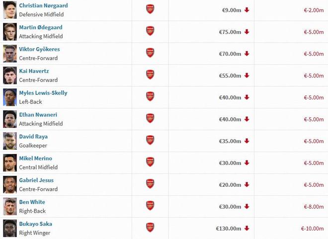 萨卡 1.3亿(下跌1000万) 萨利巴 9000万 (上涨1000万) 厄德高 7500万 (下跌500万) 苏比门迪 7500万(上涨500万) 哲凯赖什 7000万(下跌500万) 廷贝尔 7000万(上涨1000万) 哈弗茨 5500万(下跌500万) 卡拉菲奥里 5000万(上涨1000万) 斯凯利 4000万(下跌500万) 恩瓦内里 4000万(下跌500万) 拉亚 3500万(下跌500万) 梅里诺 3000万(下跌500万) 本怀特 3000万 (下跌800万) 热苏斯 2000万(下跌500万) 特罗萨德 2000万(下跌200万) 内尔高 900万(下跌200万) 凯帕 700万(下跌100万) (注:榜单中未列及的球员维持原身价,本期身价没有更新) 【上咪咕独家看英超】 |