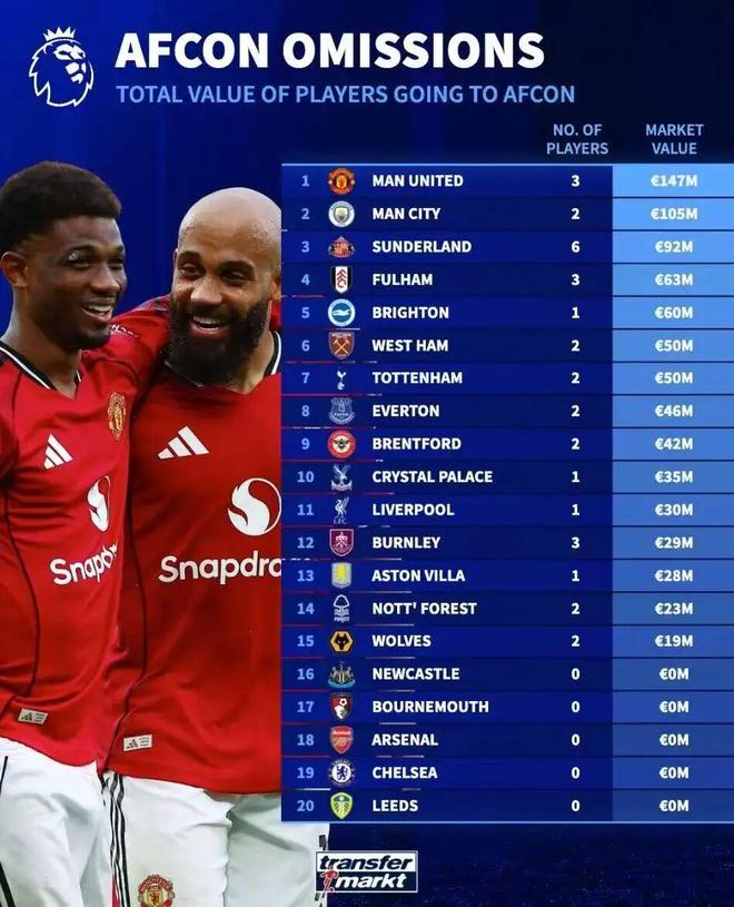 富勒姆和曼联位列第二与第三,这两支球队被征召的球员在英超中出场时间都超过3000分钟。相较之下,曼联受影响要比富勒姆大,因为他们被征召的都是核心“大腿”,一位是新援姆贝乌莫,本赛季这位喀麦隆前锋在联赛出场1404分钟,有6粒进球入账。另一位是科特迪瓦边锋阿马德·迪亚洛,本赛季至今,他攻入2球还送出2次助攻。第三位是摩洛哥后卫马兹拉维。据德转统计,本届非洲杯英超球队参赛球员总身价榜,曼联这三人以1.47亿欧元排在首位。