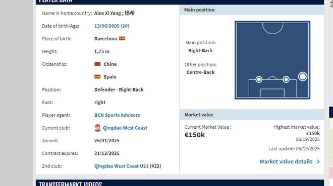 目前,杨希德转身价为15万欧,预估也会涨到25万欧左右。