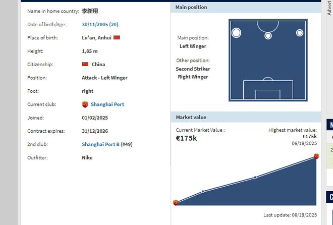 目前,李昊德转身价为15万欧,预估会涨到25万欧左右。
