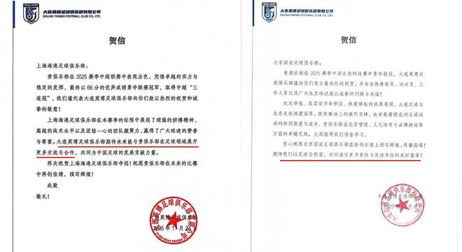 对于上港,贺电中表示希望双方俱乐部未来在足球领域展开更多的合作交流。刘祝润从海港出租到大连英博表现不错,这应该也是大连英博重点提及这点的原因。对于北京国安,贺电中则重点谈及双方的友谊,表示希望双方以足球为桥梁,共同谱写竞技和友谊并存的美好篇章